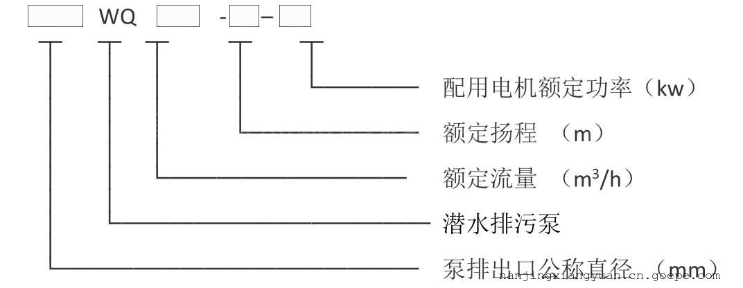 适用于化工、石油、制药、采矿、造纸工业、水泥厂、炼钢厂、电厂、煤加工工业,以及城市污水处理厂排水系统、市政工程、建筑工地等行业输送带颗粒的污水、污物,也司用于抽送清水及带腐蚀性介质。- WQ型系列无堵塞潜水排污泵型号意义: